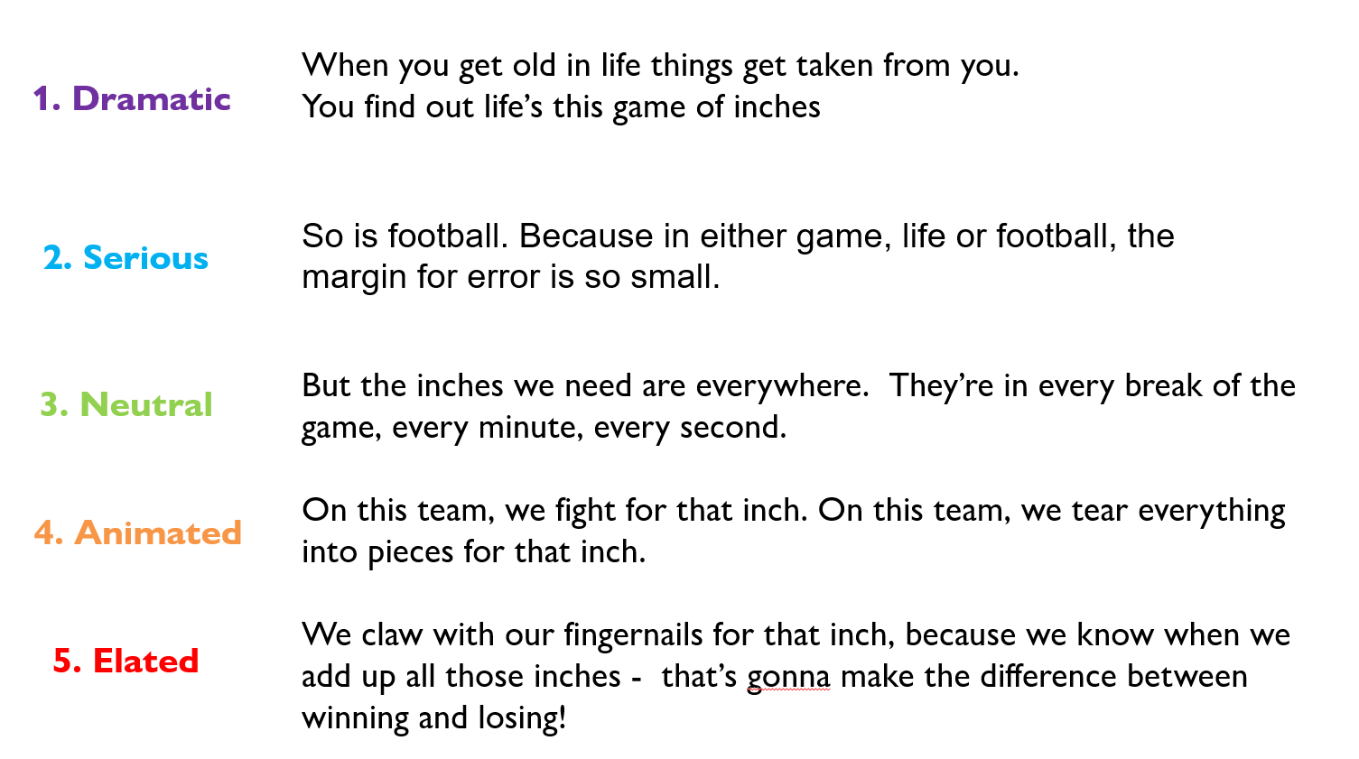 I provide the Clients with a demonstration before they try so they completely understand what to do and how much I want them to vary the intensity of their delivery through increased pitch, pace, pause, volume and tone.