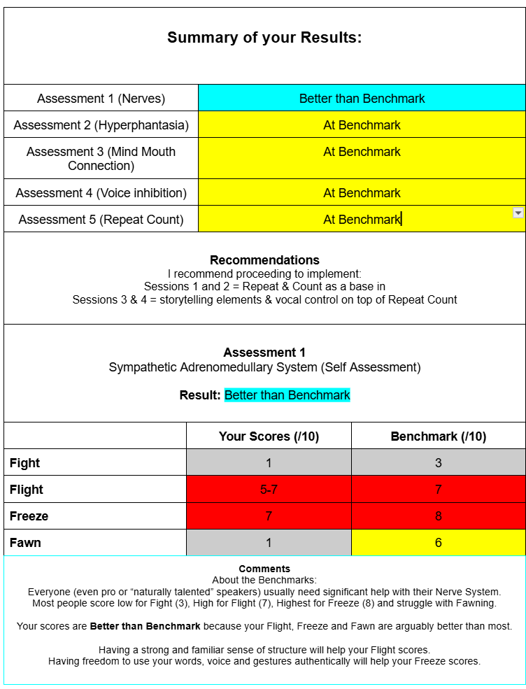 A screenshot of a Speaker Assessment from a recent client, showing that they mostly scored “at benchmark” compared to the population average but still have negative effects that noticeably inhibits performance.