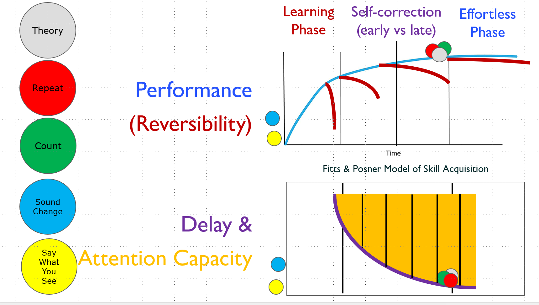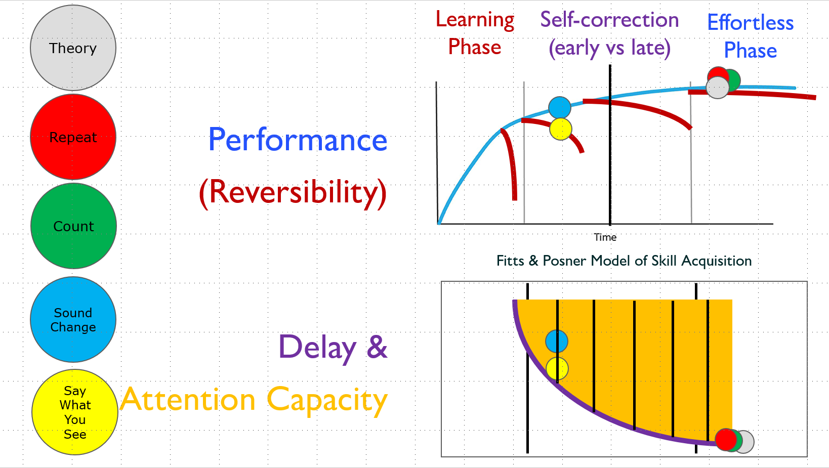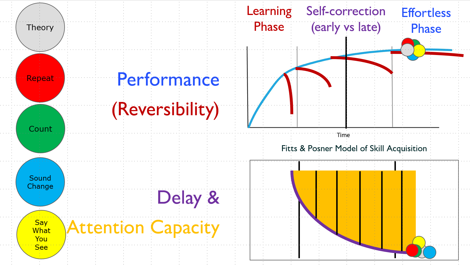 We start Specific Practice when the cross the line from the early self-correction phase to the late self-correction phase. The late self-correction phase is when my clients show signs of “intrinsic feedback” - namely they can quickly spot when they have made a mistake in their own performance. Now to progress into the effortless phase, we want that mistake spotting skill to get faster and faster (indicated by the bottom graph).